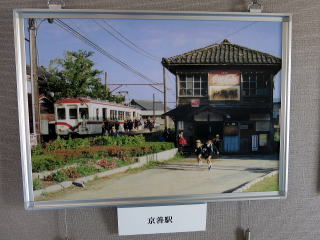 やはり旧永平寺口駅舎の交流館にあった休止前の京善駅の画像。正面の立派な木造の建物は駅舎ではなく、駅前商店。出札くらいはしていたかも知れません。近くの小学校への通学児童が多かった様子が窺えます。 |