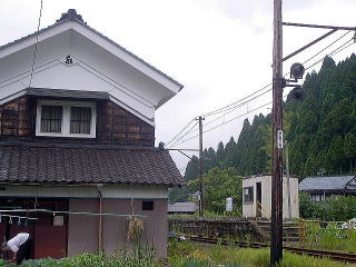立派な人家が目の前に建っていますが、その右手に見えるのが京善駅。待合室はスーパーハウスのような簡易なものでした。小学生利用の多い利用者層柄、安全上開放式の待合室を改築したのでしょう。 |