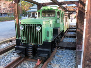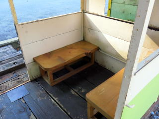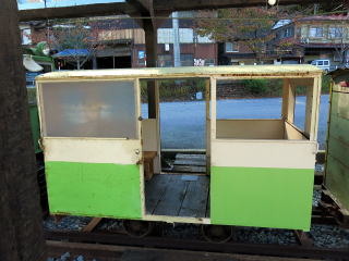 | 作業員用の人車。かなり小さなもので、坑道が狭いでしょうから、乗り心地などはお構いなしでしょう。 | 人車内部。ただこれは保存用に置かれた椅子でしょう。 | ||