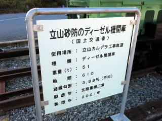 | 駅跡の入口側を向いた、メインの保存車両、国交省立山砂防のディーゼル機関車。L型の形状で、型式は不明です。 | DLの説明書き。610ミリナローゲージの平成13年製造で、令和2年に保存用に飛騨市が買い取ったものです。 | ||