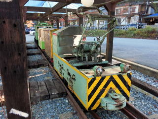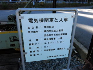 | 神岡鉱山の電気機関車。トロリー式のELです。運転席は人が入れるのか疑問の小ささです。 | ELと人車の説明書き。製造年は不明。いつからか奥飛騨温泉口駅構内に保存されていました。 | ||