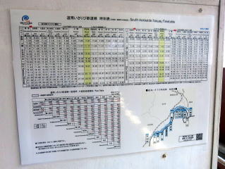 道南いさりび鉄道線 茂辺地駅 駅舎内や待合室内の掲示板の、全線時刻表。黄色の帯の箇所は自駅です。(H30.4撮影) |