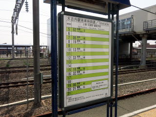 | 道南いさりび鉄道線 木古内駅 ホームの時刻表。JR北海道とほぼ同じ様式で、また駅舎内に設置してあるものも同じものです。右下に小さく社章が入っています。(H30.4撮影) |