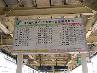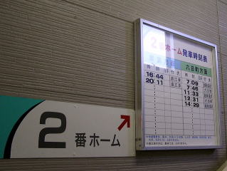 ほくほく線 六日町駅 JR同一構内ですが北越急行専用ホームの時刻表。一部特急も停車しますが、JRホームに停まるためここには表記はありません。(H16.7撮影) |