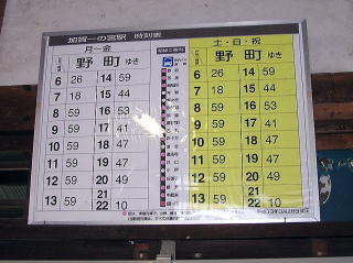 | 石川線 鶴来駅 平日ダイヤと土日ダイヤ併記。北鉄はバス停のバス時刻表も日祝ダイヤは黄色地で表記します。以遠の加賀一の宮方面は本数が少ないので一枠に列記してあります。(H16.7撮影) |