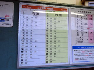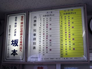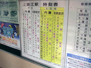 浅野川線 三ツ屋駅 ここまでの画像のものよりも幾分新しい時刻表。急行は平成18年に廃止となったためピンクの表示がなくなりました。(H25.10撮影) |