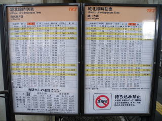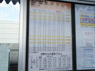 | 城北線 味美駅 全線の時刻表が表記されたタイプで、右がホーム手前にある上下双方向のもの、左がホームの、乗り場側の時刻表です。基本的に左から右に時刻が経過するような表記ですが、ホームの向きにより、右の画像のものは右から左となっています。表題の濃いオレンジの箇所が自駅で、黄色い帯は土休または休日運休の列車です。 |