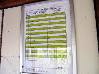 | 宗谷本線 名寄駅 標準的にコーポレートカラーの黄緑ラインの時刻表です。乗換案内を流用したもの。中規模駅ではこのような自立式のものが多いようです。(H20.11撮影) |