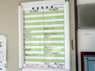 | 石北本線 白滝駅 ホームのものと同じ様式ですが、駅舎内の壁かけタイプのもの。赤文字は特急列車です。(H20.11撮影) |