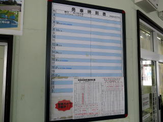 | 石北本線 やはり駅舎内の通常の時刻表と、到着時刻表。折り返し列車や長時間停車の列車もありますが、特急などはほど同時刻が記載されており、見比べても楽しめ、時間つぶしになります。そんな設置意図ではないでしょうが。(H24.1撮影) |