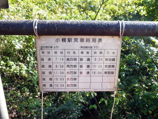 | 室蘭本線 小幌駅 秘境駅として名高い小幌駅の時刻表。ホーム柵に結わえてありました。上り5本、下り3本は意外に多い方でしょうか。(H21.9撮影) |