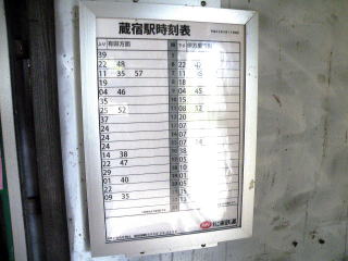 | 松浦線 蔵宿駅 最も一般的な様式。中央にグレーの帯で時刻帯が書かれ、左右に分表示があるタイプ。右下に社名が入ります。(H25.8撮影) |