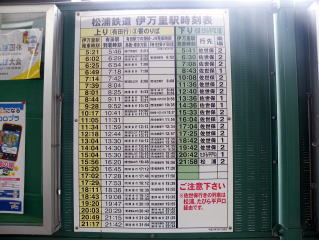 | 松浦線 伊万里駅 ラミネートされた時刻表。上り方面は終点有田駅の到着時刻と接続するJR列車が書かれています。また上りは全て佐世保行きですが、有田乗換えより大回りとなる松浦経由である注意書きがあります。(H25.8撮影) |