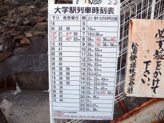 松浦線 大学駅 同じく駅入口にあったもの。赤文字は快速で、また上り方面のみ行き先が分の脇に記されています。(H25.8撮影) |