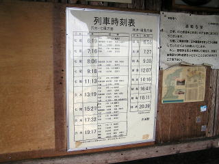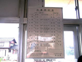 | 能登線 珠洲駅 / 矢波駅 デザイン的には配色のない非常にシンプルな時刻表です。行き先、時刻が記されていますが、時刻の上に小さく列車番号も書かれています。また上り方面にのみ備考欄があり、終着及びその先の和倉温泉、七尾から金沢方面への接続列車が記されています。(H16.7 / H16.12撮影) |