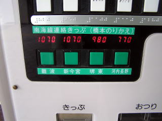 | 和歌山線 粉河駅 「JRきっぷ」の下に緑の帯で「れんらくきっぷ」の文字のある簡易券売機。線内橋本駅で接続する南海線の主要駅までのきっぷが購入できます。最下段の緑色のボタンがそれです。(H19.4撮影) |