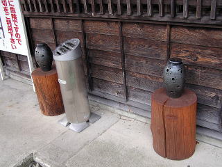 駅舎前の喫煙所。民芸品のオブジェと共に。灰皿はJTのものですが、線内共通です。(H19.8撮影)