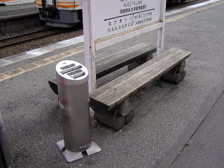 駅名標の位置にあるベンチ脇の喫煙所。場所的にはホームの中央のベストポジションにありました。(H19.8撮影)