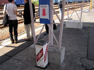 | 岳南線 吉原駅 ホームの喫煙所。喫煙場所を指定していますが、上屋下の乗り場付近です。灰皿はJTの、タバコの銘の入ったものです。(H20.4撮影) |