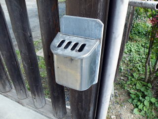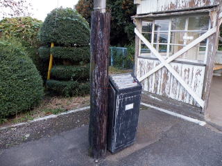 | 水郡線 下野宮駅 駅舎の木柵に設置された小さな灰皿。「屋内」からは外れています。(H23.10撮影) |