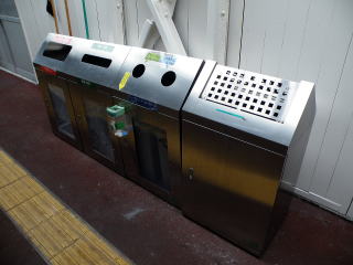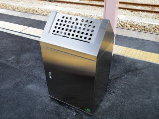 | 信越本線 豊野駅 新しいタイプのステンレスボディの灰皿。粗いメッシュ状の投函口が特徴です。(H22.8撮影) |