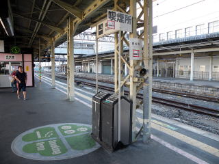 | 東北本線 郡山駅 旧タイプの灰皿が主要駅にも残っていました。喫煙所表記の、結構高い位置の看板が設置され、喫煙エリアを示す標示も四つ葉のクローバーマークのものです。ABCの意味が分かりませんが。またこの標示、近辺の標準的なものかは不明です。(H23.7撮影) |