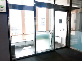 | 北海道新幹線 木古内駅 ホームの喫煙所。相対式ホームなので片面からの出入りですが囲われた喫煙室です。中には細長い灰皿が設置してあります。(H30.4撮影) |