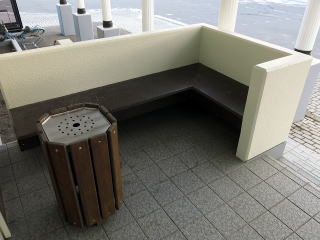 日高本線 新冠駅 駅舎入口の喫煙所。軒下のベンチつきの喫煙コーナーです。設置は町の設置ではないでしょうか。(H26.1撮影) |