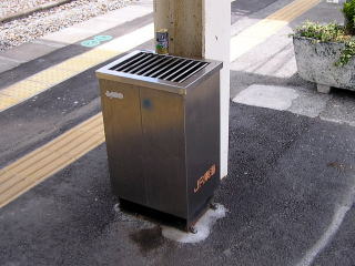| 高山本線 高山駅 JR東海の喫煙所は基本的にくずもの入れとのセットです。高山本線や飯田線などでは意外とホーム中央に設置してあります。今のところは。(H16.8撮影) |