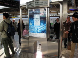 | 東海道新幹線 名古屋駅 / 新大阪駅 新幹線ホームの喫煙コーナー。中央に内照式の広告看板が入り、上部に喫煙コーナーの看板、両脇に大型の灰皿を設置しています。ホームの乗り場付近にありますが、喫煙車乗り場付近なのでしょう。(H21.1 / H21.9撮影) |