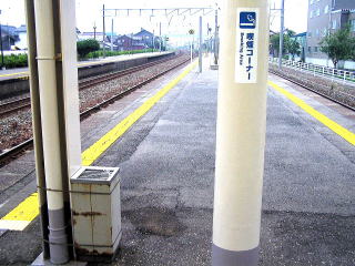 | 北陸本線 美川駅 ホーム上屋端にあった喫煙所。優等待避の際に使用する2番線に停車した場合乗り場にかかる位置です。(H16.9撮影) |