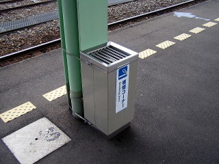 | 山陽新幹線 福山駅 灰皿部分がナナメにカットされた大型のもの。旧来からある形状ですが、微妙に改良されたか、新しいタイプです。(H17.10撮影) |
