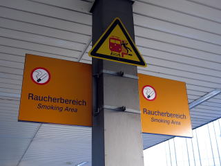 | ドイツ鉄道 ケルン中央駅 ホームの喫煙コーナー。ホームのやや隅の方でしたが、ベンチなども近くにある位置です。オープンで場所の指定がしてあります。現在は分かりませんが、感覚的に西欧は同時期の日本よりも喫煙者割合が多く、喫煙所も充実していました。そして吸いがらのポイ捨てもかなり多かったように感じました。禁煙先進地方という先入観があったためかも知れませんが…。(H27.5撮影) |