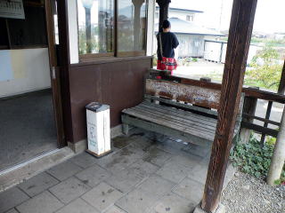 | 長野線 中野松川駅 駅舎の玄関前、軒下にある喫煙コーナー。ベンチが置かれています。灰皿はJTのものです。(H23.11撮影) |