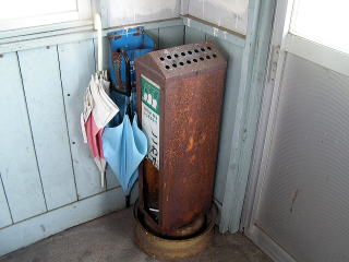 | 樽見線 水鳥駅 新線区間の待合室にも中に吸いがら入れがあります。この後近い時期に外に出されたことでしょう。(H16.7撮影) |