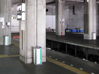 | 立山線 立山駅 ホームの喫煙所。特急停車駅だからか、一つのホームにも複数の灰皿が設置してあります。喫煙者に優しい仕様ですが、この訪問1か月後に下の画像です。(H16.2撮影) |