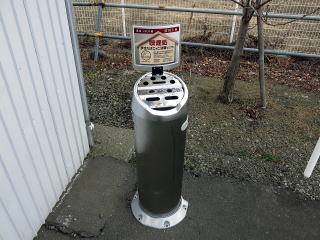 待合室から外れた位置にあった喫煙コーナー。歩きタバコは禁止である旨記された小さな看板が灰皿に設置してあります。喫煙所設置位置も含め、他の地方民鉄より進んでいるように見えますが、他社よりこの訪問の時代が進んでいるだけですので…。(H28.2撮影)