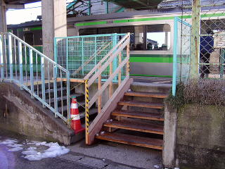 | 駅舎内はあまり変わりませんが、待合室が改修で半分程度に縮小されました。 | 裏手の北口は以前は無改札でした。これは平成17年の画像で、北口整備直前の仮設入口です。(H17.1撮影) | ||
