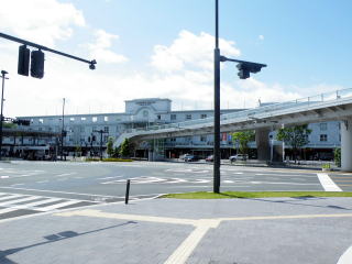 駅舎正面。こうして見ると国鉄的な駅舎です。が、うまく洒落た改修をしています、が、やはり真正面に歩道橋入口があるため引きが取れません。 |