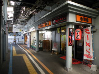 | 1番ホームには飲み屋街のような雰囲気の飲食コーナーがありました。熊本ラーメンと牛丼屋。一番奥は土産物屋でしたか。 |