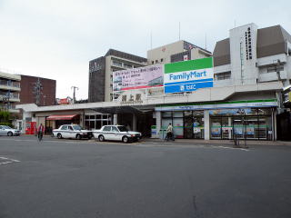 | コンクリート造の駅舎でした。背後の病院と重なって見えますが、駅舎は平屋建てでした。現在駅前にあるコンビニが駅舎内に入っていました。(H23.4撮影) |