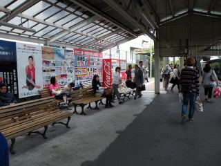 駅舎に接しない2番ホームの待合所。上屋下で、ホームの広い個所にベンチを集めていました。 |