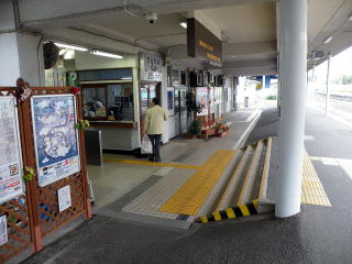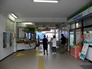 駅舎内。券売機が2台。右手にはコンビニがあります。窓口もコンコースにあり、市内中心地区の駅としては手狭でした。 |