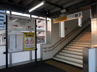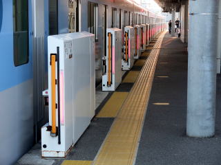 | 駅名標は橋上駅舎への階段前、ホームが広くなった箇所にありました。 | ホームドアは駅開業後の設置です。接触防止か、ドアの開いた状態では赤い警告灯が点灯します。 | ||||||||||||||||
