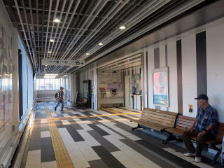 | こちらは北口。衣装的には南口と同じです。こちら側には郊外型店舗がいくつか並びます。 | 駅舎内、自由通路。シンプルな外観に対し、モザイク様の床デザインが目を引きます。 | ||||||||||||||||