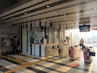 | 改札口。窓口も営業していますが早朝のため開いていませんでした。 | ホームは2面2線。柵のようなホームドアがあります。 | ||||||||||||||||