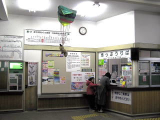 | 駅舎内の落下傘キツネ。随分以前からぶら下がっており、もはや名物でしょうか。この手前側に待合室があります。 | 改札脇に「アララギ之里」の看板があります。 | ||||||||||||||||