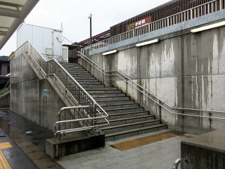 | 駅舎入口の階段。この奥に新設のエレベーターがあり、またこの手前側に2階建の駐輪場があり、そこから駅舎前に通じる通路もあります。 | 駅舎内。券売機が2機あり、窓口が営業しています。改札機があることもありかなり狭いです。 | ||||||||||||||||