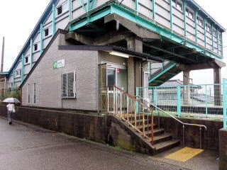 | 跨線橋から見た構内。上屋は元々跨線橋付近と、右手奥の駅舎付近にしかなかったのでしょう。中間の上屋は低いものです。奥にエレベータ跨線橋があります。 | ひっそりとした裏口、北口があります。この中にもちゃんと券売機、改札機があります。 | ||||||||||||||||