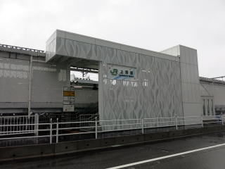 | 駅舎入口の裏にエレベーター、その背後に地下道の入口があり、南北自由通路ですが、元々この場所にあった歩行者地下道です。 | 駅の北口。こちらは南口より狭い路地に面し、機能、デザイン的に同じですが、送迎者の停車は出来ず、裏口然としています。 | ||||||||||||||||